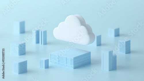 3D rendering of a cloud with networked servers and buildings, symbolizing cloud computing, data storage, and technology infrastructure.