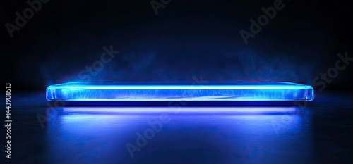 3D rendering of a futuristic background with a blue light podium and a dark room interior for a product presentation, virtual show stage design, or e-commerce display in a cyberpunk style. Futuristic
