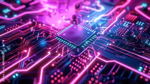 3D rendering of a futuristic circuit board with purple and blue lights flashing. The image is very detailed and shows the complexity of the circuit.