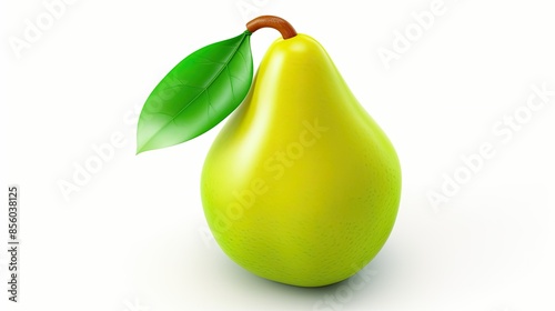 3D rendering of a green pear with a leaf on a white background. The pear is in focus and has a smooth, glossy surface.