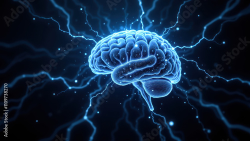 3D rendering of a human brain emitting electric blue lightning bolts, symbolizing artificial general intelligence (AGI).