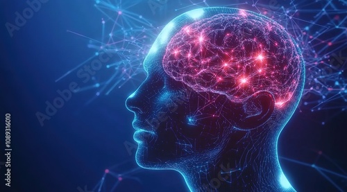 3D rendering of a human head with a brain and neural network on a dark blue background