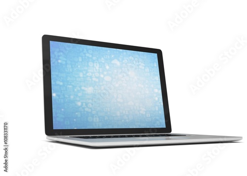 3d rendering of a laptop with blue wallpaper with app icon