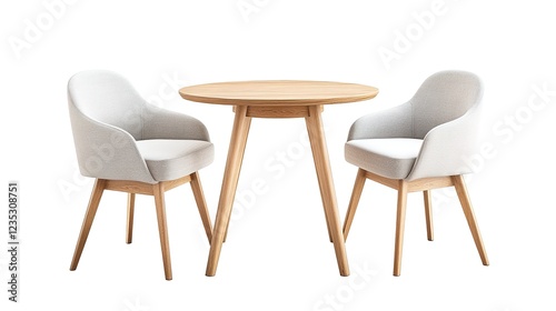 3D rendering of a modern minimalist dining table with two chairs, isolated on a white background.