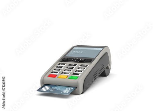 3d rendering of a POS-terminal with a generic plastic card inside and a screen with a writing AMOUNT on it.
