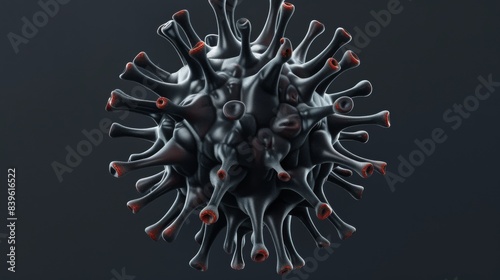 3D rendering of a virus particle with detailed structural features on a dark background.