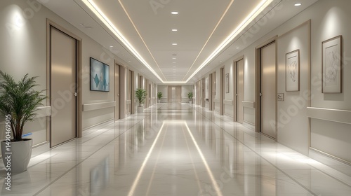 3D rendering of an empty, gleaming hospital hallway with smooth surfaces and minimalistic design, sliding doors on either side
