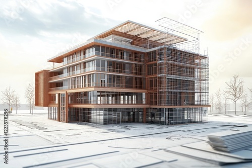 3D rendering of architectural projections, showing detailed design and construction plans of a building.