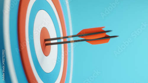 3D rendering of arrows hitting the center target on a blue and white background, representing success in business or customer acquisition goals.