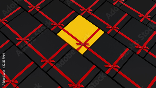 3d rendering of Black gift box with shiny red ribbons withe yellow box in the middle ,