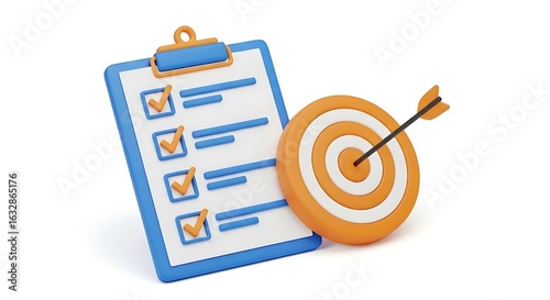3D Rendering of Clipboard with Checkmarks and Arrow Hitting Target Bullseye