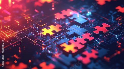 3d rendering of glowing puzzle piece in dark space with neon light.