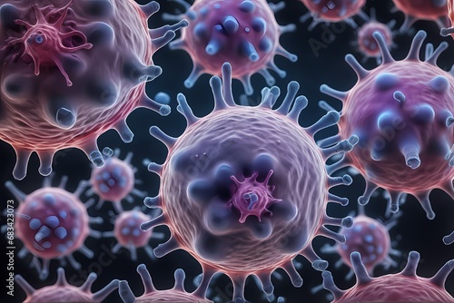 3D rendering of microscopic human and cancer cells on science day background