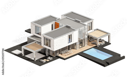 3d rendering of modern cozy house by the river with garage for sale or rent. Isolated on white.
