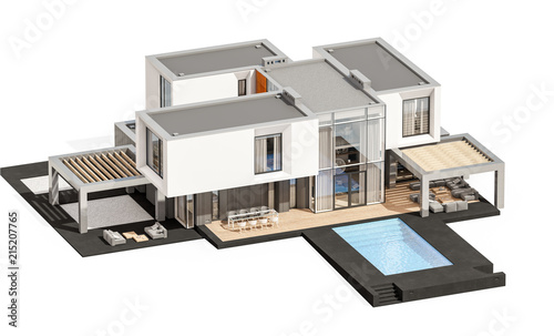 3d rendering of modern cozy house by the river with garage for sale or rent. Isolated on white.