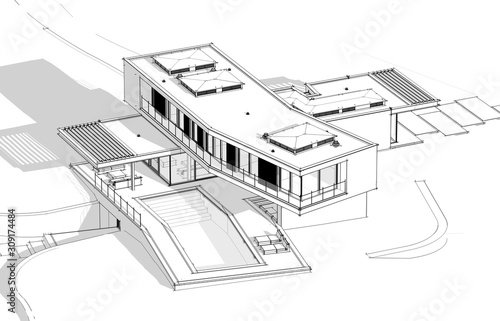 3d rendering of modern cozy house on the hill with garage and pool for sale or rent. Black line sketch with soft light shadows on white background.