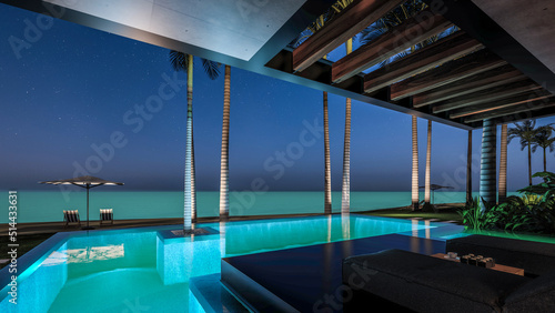 3d rendering of modern cozy house with parking and pool for sale or rent with wood plank facade by the sea or ocean. Starlight night by the azure coast with palm trees and flowers in tropical island
