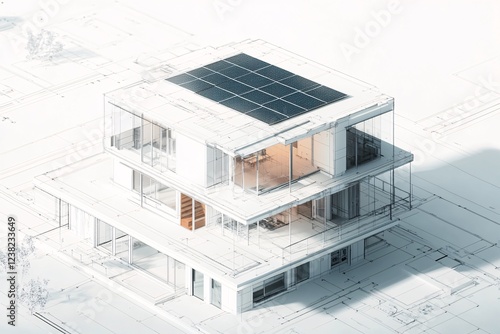 3D rendering of modern eco-friendly house with solar panels, architectural blueprint overlay, sustainable living, futuristic home concept