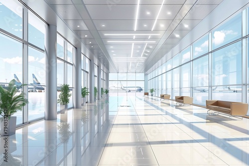 3D rendering of office background, modern business hall with light reflection on the floor, airport for background.