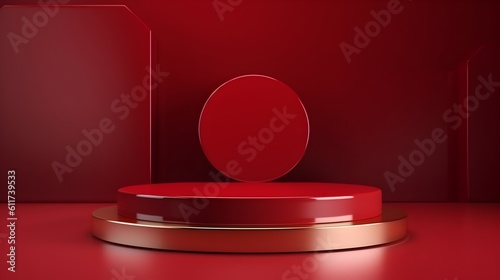 3d rendering of red podium on red curtain background. Luxury and elegant concept.