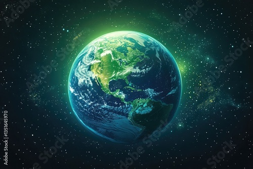 3D rendering of the Earth glowing green in space. The planet is centered and surrounded by stars. There's some light reflecting off it, creating highlights on its surface