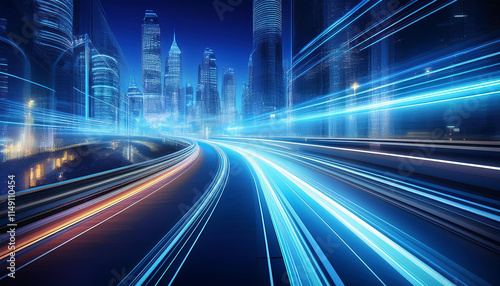 3D Rendering of warp speed in hyper loop with blur light from buildings' lights in mega city at night. Concept of next generation technology, fin tech, big data, 5g fast network, machine learning