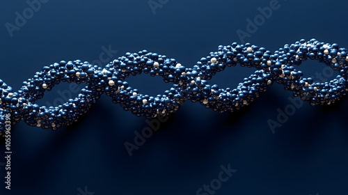 3D representation of a DNA double helix structure with interconnected particles on a dark background, symbolizing genetics, science, and biotechnology.