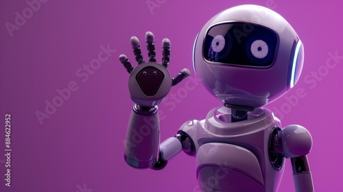 3D robot in purple background with hand up, expressing hello or support. Friendly chatbot renders for technology and robotic toy concepts.