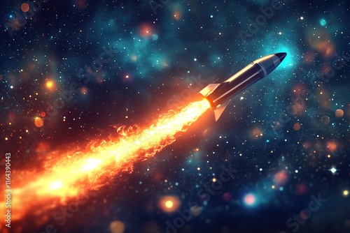 3d rocket leaving glowing trail in deep space framed by blurred nebulae and vibrant stars