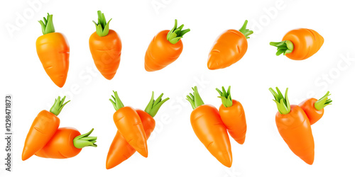3d set of carrot in different angles. Orange vegetable with green leaf isolated on transparent background. Organic healthy food. Easter decoration, design elements Cartoon render icon. 3D illustration