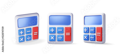 3D set of modern calculator isolated on white. Render mathematics icon. Addition, subtraction, multiplication and division buttons. Arithmetic operations. Financial math device. Vector illustration