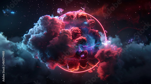 3D Spectacular cosmic cloud explosion within transparent sphere with red background. Nebula and stars in space concept with red neon. Abstract wallpaper and creative design, AI Generative.