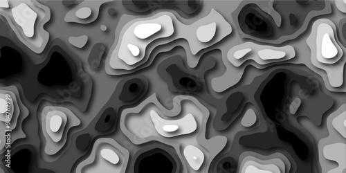 3D Stylized Gray Topographic Contour Scheme and Terrain. Geographic mountain terrain. Contour map background. 3D Cartographic Weave with seamless striped patterns and wavy Shapes.