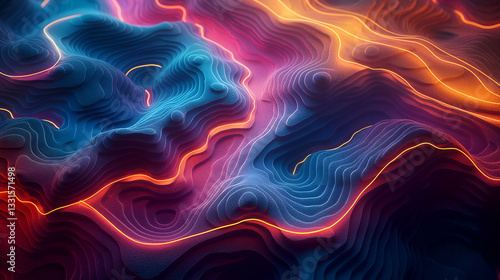 3D Topographic Landscape Neon Lines, Colorful Wave Pattern for Digital Art Background