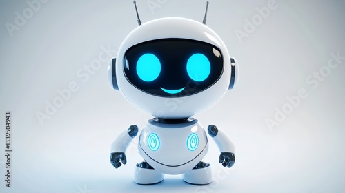 3D vector chatbot icon styled as a charming robot with a bright digital smile and blue eyes in soft white tones
