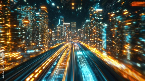 3D visualization of a hyperloop racing through a glowing cityscape. Nighttime scene with blurred lights from skyscrapers emphasizing future tech.