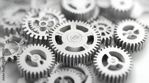 3D Vote Count Gears Mechanism Concept - Close Up Vector of Interlocking Gears Forming Vote Counting System, Zooming Out on Isolated White Background with Tally Space