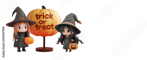 3D Witch Halloween Celebration: Trick or Treat with Witch in Cartoon Banner with Text Copy Space, Isolated on Transparent Background, PNG
