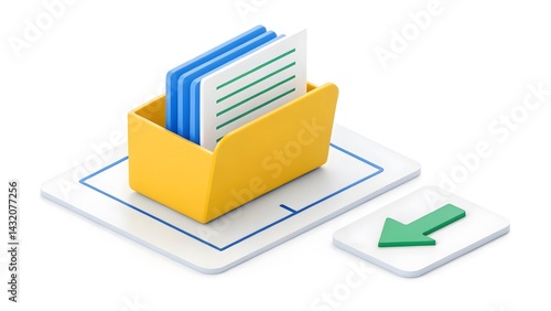 3D Yellow Folder with Documents and Green Download Arrow for File Storage Data Transfer and Digital Organization in Technology Design