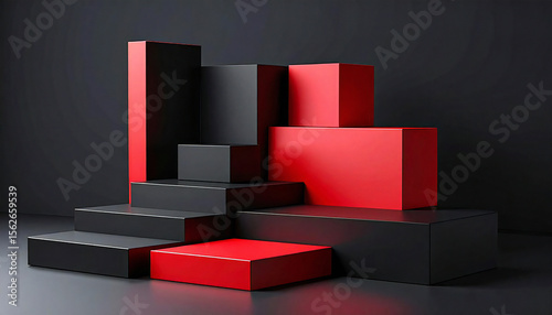 黒と赤の幾何学の物体がある空間。3D。立体的なブロックスタイル。Space with black and red geometric objects. 3D. Three-dimensional block style.