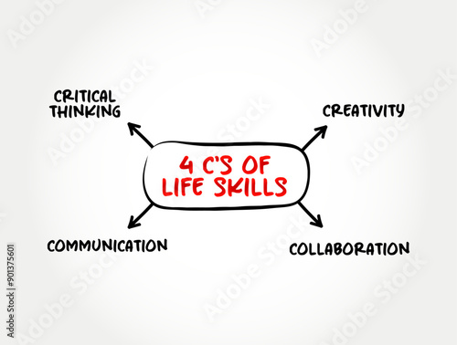 4 C's of Life Skills - abilities for adaptive and positive behaviour that enable humans to deal effectively with the challenges of life, mind map text concept background