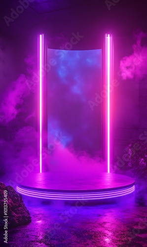 4. **Cyberpunk Galaxy Stage:** Depict a vibrant podium with a galaxy theme, framed by neon lights in a cyberpunk style. The scene is filled with glowing purple hues and a misty ambiance, perfect for