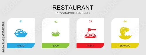 4 restaurant filled icons set isolated on infographic template. Icons set with Salad, Soup, Pasta, Seafood icons.