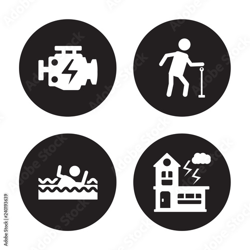 4 vector icon set : Engine problems, Drown, Elderly, Disaster isolated on black background