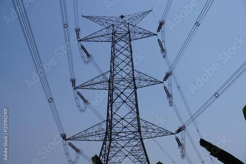 400kV quad transmission line tower which towers support conductors carrying electrical power, typically made of steel, and are designed to withstand high voltages and wind speeds