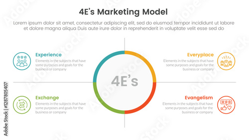 4E marketing model infographic 4 point stage template with big circle center and outline box description for slide presentation