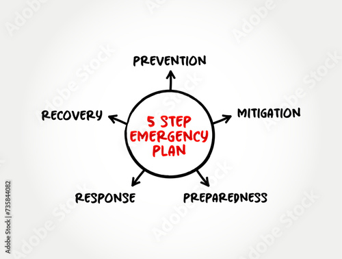 5 step emergency plan - specifies procedures for handling sudden or unexpected situations, mind map text concept background