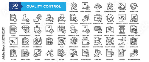 50 Quality Control icon set. Containing design Defect Detection, Compliance Check, Control Chart, ISO Certification, Material Inspection