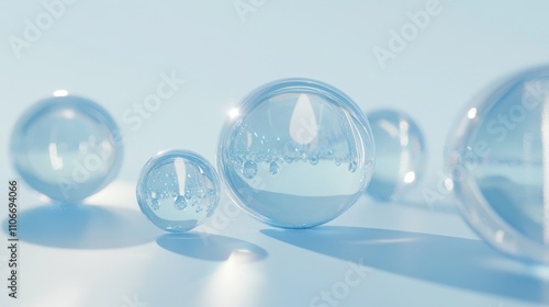 50.Blue minimalist background featuring several transparent glass balls arranged in a geometric pattern. Sunlight softly interacts with the spheres, creating delicate highlights and reflections,