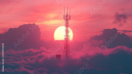 5G Sunset Cell Tower: Cellular communications tower for mobile phone and video data transmission